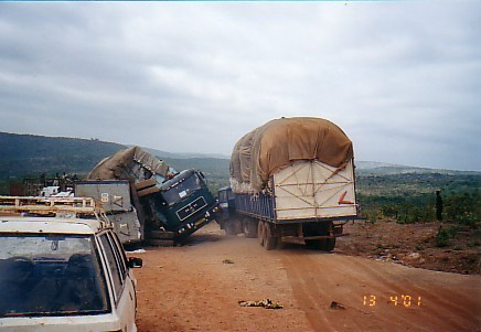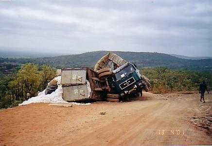 Ce qui est le cas. Un accident vient de se produire sous nos yeux. Il s'agit de camions de transport de coton. Par chance il n'y a pas de blessé.